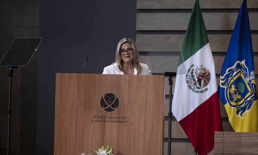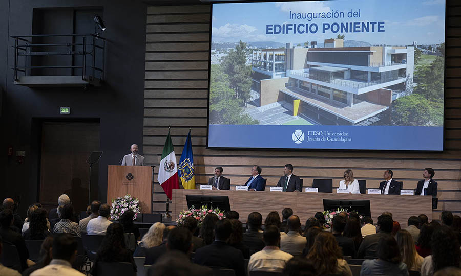 Es martes y todavía se sienten los efectos de la lluvia de la noche anterior. En el nuevo auditorio están congregadas autoridades del ITESO, de la Compañía de Jesús, así como representantes de gobierno y de la comunidad universitaria. La ceremonia para inaugurar el nuevo edificio del campus es conducida por Mónica Durán Labrador, directora de la Prepa ITESO, y por Carlos Araujo, exdirector del bachillerato y actual director de la Oficina de Educación Continua. Ceden la palabra a Guillermo Gatt Corona, quien, dice, da la bienvenida a las y los asistentes “como presidente de ITESO, AC, pero también como egresado y profesor”. Después menciona que con la apertura del nuevo edificio el campus se consolida como uno “de los mejor equipados, seguros y sostenibles de México”. El diseño del arquitecto Javier Díaz, dice Gatt Corona, “es un orgullo como itesianos y como jaliscienses”.